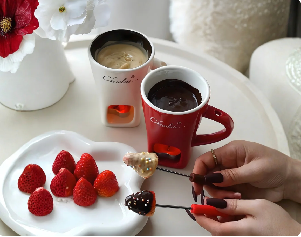 Du får en komplett fondue-mugg med keramikskål, värmehållare för värmeljus och gafflar för doppning. Allt du behöver för att komma igång finns med – du behöver bara tillsätta choklad och värmeljus.